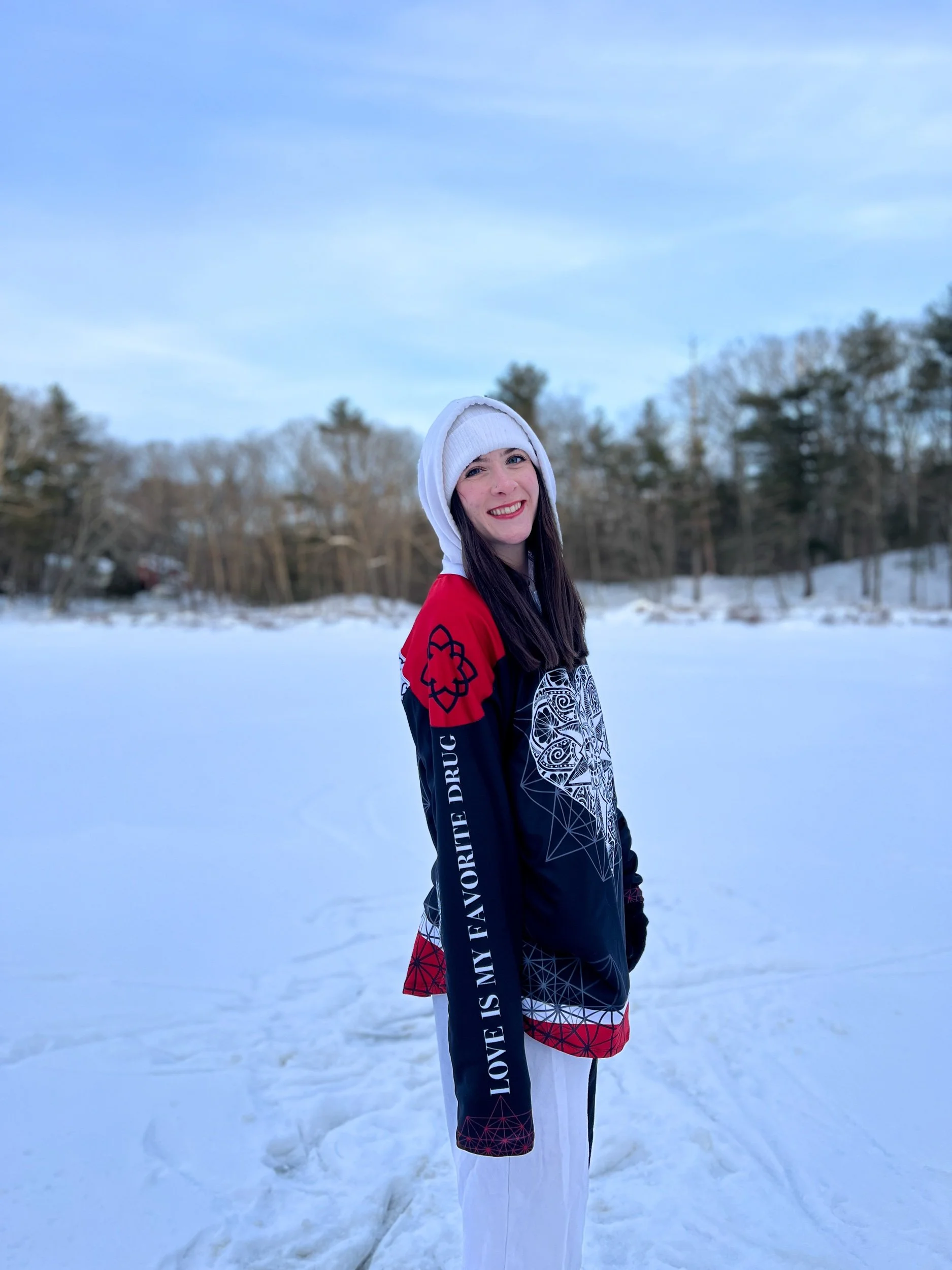 LOVE IS ALL AROUND YOU 222 open edition hockey jersey featuring Atira's drawing 'Heart Centered Mandala'.